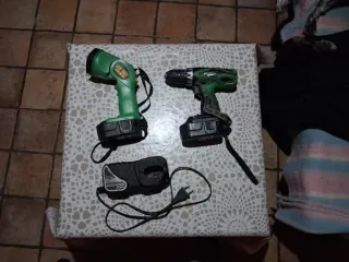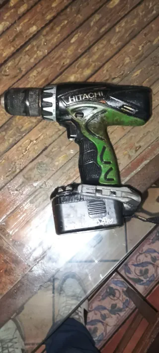 Se vende lote de herramientas variadas, incluyendo taladros y cargadores. - Taladro verde Hitachi. - Taladro rojo. - Cargador Hitachi 7.2V-24V. - Baterías EB24H.