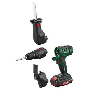 PARKSIDE® - Multiherramienta a bateria 20V Características -Taladro, atornillador, sierra de sable, lijadora y herramienta multifunción -Kit con batería y cargador -Cambio de accesorio rápido y sin herramientas -Potente batería de iones de litio de 20V con indicador de estado LED de 3 niveles -Control de velocidad variable incl. giro izquierda-derecha y parada rápida -Unidad de motor con mango ergonómico y agarre suave antideslizante -Con 2 porta-brocas magnéticos en el aparato -Cargador de batería con desconexión automática e indicador LED de carga -En un práctico maletín de almacenamiento