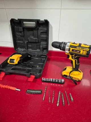 Taladro-atornillador YIKODA de 12v y 28Nm de Par max. con 1 batería de iones de Litio de 1,5Ah, 1 cargador y 1 compacto maletín rígido. Tiene 2 velocidades, 25+1 posiciones de apriete, luz de trabajo, indicación de carga, mandril para brocas de 0,8 a 10mm y maletín rigido. Nuevo, solo probado. Es mi precio mínimo.