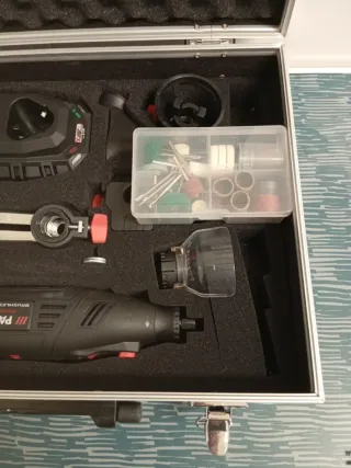 🔴 SOMOS TIENDA PROFESIONAL 💥Set de herramienta rotatoria Parkside con varios accesorios. - Incluye herramienta rotatoria. - Cargador y batería. - Caja de accesorios con brocas y discos. - Maleta de aluminio de transporte. tags: Lidl, Bosch, Maquita, Dewalt, Stayer, Inverter, Hilti, Worx, Metabo, Einhell, carpintero, carpintería, batería, pintór, pintura, reforma, obra, metal, percusión, radial, amoladora, sierra caladora circular laser, compresor, llave, atornillador, atornilladora, soldar, soldadura, aparato, pistola, grapadora, lijadora herramienta compresor, ingletadora, impacto, fresadora, broca, aspiradora, taladro martill