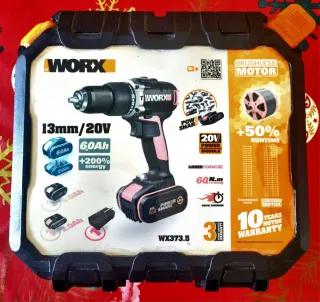 Taladro y atornillador marca Worx con motor Brushless. - Modelo: WX373.5 - Voltaje: 20V - Capacidad de batería: 6.0Ah y 2.0Ah - Mandril: 13mm - Torque: 60 N.m - Incluye cargador rápido.