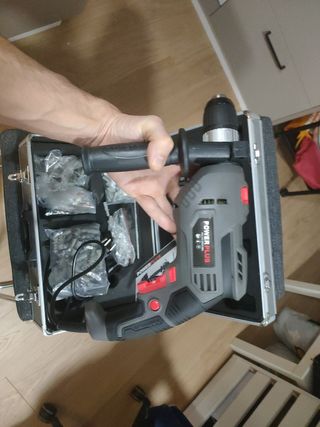 Taladro percutor electronico 720W Powerset6. Tope de profundidad Empuñadura adicional Manual 3. Brocas para hormigón, 6mm 3 brocas para hormigón 8mm 3 brocas para hormigón 10mm Tornillos pozidriv (50 4*30) (30 5*40) (20 6*50) 50 tacos 6mm 50 tacos 8mm 50 tacos 10mm Todo con apenas 3-4 usos, en perfecto estado El maletín si está un poco roto, pero firme.