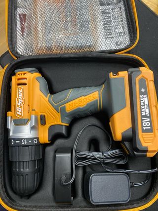 Taladro inalámbrico Hi-Spec con batería de 18V. - Incluye taladro, batería, cargador y maletín. - Batería Max Plus 18V. - Ajuste de par de 13-15.