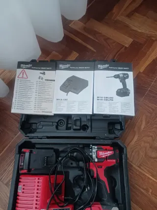 Taladro atornillador inalámbrico de la marca Milwaukee en color rojo. Incluye cargador y baterías. - Modelo M18 CBLDD M18 CBLPD. - Cargador M12-18C. - Incluye manuales.