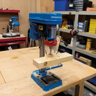 Soporte de banco para taladro, ideal para trabajos de precisión. - Base robusta para mayor estabilidad. - Mordaza integrada para sujetar piezas. - Palanca de bajada para el taladro.