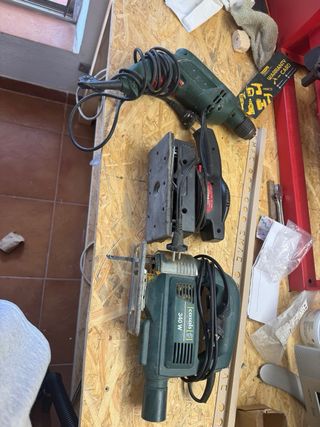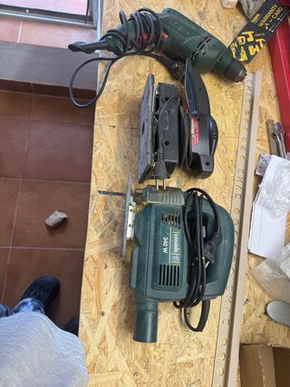 Se vende un lote de herramientas de mano y eléctricas, ideal para trabajos de bricolaje o profesionales. El lote incluye una gran variedad de artículos. - Taladros y atornilladores. - Sierras circulares y de calar. - Amoladoras y lijadoras. - Herramientas de corte y medición. - Escalera plegable. - Conos de señalización.