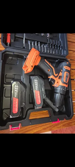 Taladro inalámbrico con dos baterías de 21V. - Incluye maletín. - Variedad de brocas y puntas.