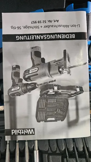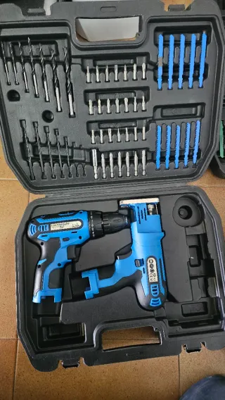 Set de herramientas eléctricas en color azul, incluye sierra y taladro. - Taladro eléctrico con brocas. - Sierra eléctrica con hojas. NUEVO SIN USO FALTA LA BATERIA + CARGADOR SE PUEDE COMPRAR POR INTERNET marca weltbild