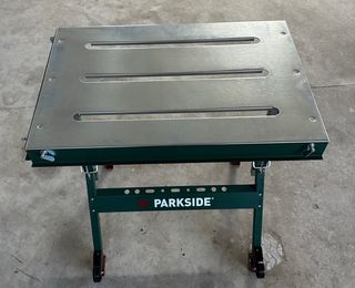 Mesa de trabajo plegable con superficie metálica y estructura resistente. - Superficie de trabajo de metal. - Patas plegables para fácil almacenamiento. - Diseño robusto y duradero. #tags: amoladora, radial, taladro, atornillador, percusión, percutor, corte, disco, lijadora, batería, cargador, soldador, orbital, excéntrica, martillo, perforador, aspirador, alicate, tenaza, remachadora, crimpadora, grapadora,lima, laser, pistola, impacto, lona, manguera, aire, coche, tornillo, vaso, Parkside, Milwaukee, Makita, Bosch, Hilti, Dewalt, Parkside Performance
