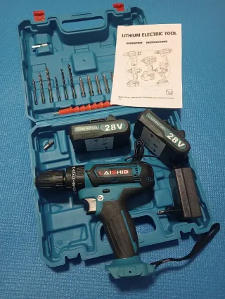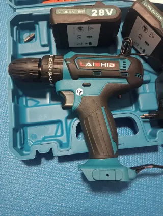 Taladro percutor atornillador inalámbrico de la marca LAISHID. - Incluye dos baterías de 28V. - Viene con cargador. - Set de brocas ,bocas y puntas. - Maletín de transporte. - Alargador flexible para sitios difíciles. - Libro de instrucciones. - Compacto y potente. - Regala artículos útiles.