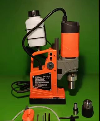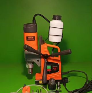 Taladro magnético de la marca Vevor, ideal para trabajos de perforación. - Color naranja y negro. - Incluye depósito para refrigerante.