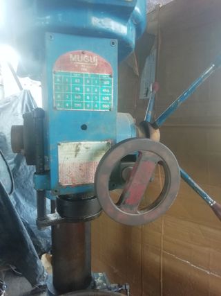 Taladro de columna de uso industrial, ideal para talleres y trabajos de precisión, con base pesada, mesa regulable, ideal para madera o metal. Trifásico. Funcionando perfectamente. - Color verde azulado. - Estructura robusta de metal.