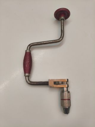 Taladro manual antiguo, en buen estado. Ideal para trabajos de precisión. - Mecanismo de manivela. - Mango de madera. - Cabezal metálico.