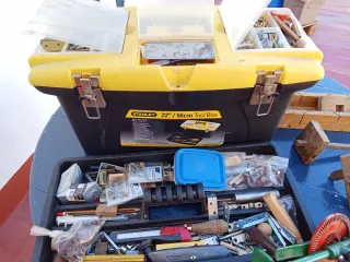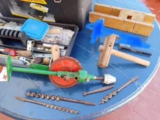 Conjunto de herramientas y accesorios de carpintería , restauración de muebles o bricolaje de la madera. Solo se vende uno de los dos gramil que salen en las fotos ( el mas grande ), el otro no . - Caja de herramientas Stanley 22 / 56cm. - Taladro antiguo manual de manivela con brocas. - Brocas de diferentes tamaños. NO Vendo nada suelto.