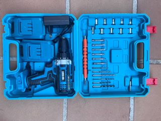 Maletín completo de taladro/atornillador/percutor inalámbrico ideal para bricolaje en casa o taller. Incluye taladro 48V, 2 baterías recargables de alta capacidad y cargador rápido. Múltiples accesorios: 3 brocas para piedra, 3 brocas para madera, puntas de atornillar, vaso de llaves de tubo, alicates, destornilladores, cúter, cinta métrica, cinta aislante y eje flexible extensible para zonas de difícil acceso. Velocidad regulable y función percutor para paredes. Todo organizado en resistente maletín de transporte. Nuevo sin usar.