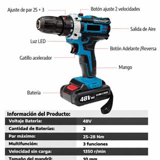 Taladro atornillador 48V potente y versátil, ideal para bricolaje y uso profesional. Cuenta con ajuste de par 25+3, 2 velocidades, función atornillador, taladro. Incluye 2 baterías Li-ion 2.0Ah para mayor autonomía, cargador y maletín rígido con completo kit de accesorios: brocas, puntas y vasos. Diseño ergonómico con luz LED integrada para trabajar en zonas con poca iluminación. Mandril de 10 mm y velocidad hasta 1350 rpm. Ligero, cómodo y fácil de manejar. Perfecto para madera, metal y paredes. Producto nuevo, listo para usar. Ideal para casa o taller.