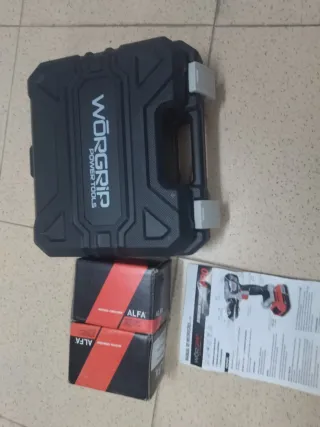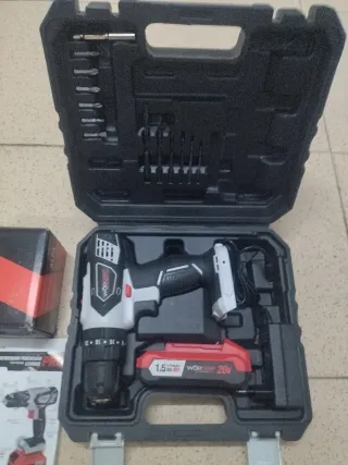 Taladro atornillador de la marca Worgrip, modelo 20V. Usado una vez - Incluye maletín para transporte y almacenamiento. - 3 Baterías de 1.5 Ah. - Cargador de batería. - Juego de brocas y puntas.
