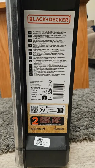 Taladro percutor Black+Decker de 18V con batería de litio de 2.0Ah Precio en tienda 130€ Incluye: - 2 Baterías 2.0 Ah 100 - Set de accesorios, entre los que hay 10 brocas variadas, 20 puntas, 12 llaves hexagonales, Flexómetro, Cutter, 10 tacos + 10 tornillos. -Cargador 400mA -Maletín de almacenamiento y transporte.