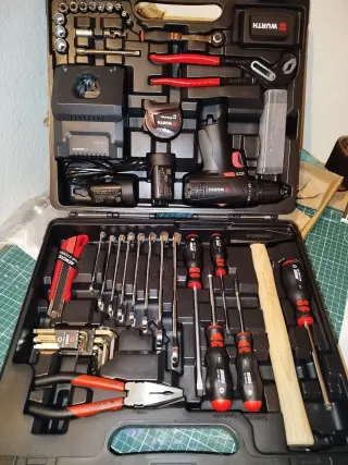 Completa caja de herramientas de la marca Wurth, ideal para tener todo organizado. 75 piezas - Incluye taladro inalámbrico. - Juego de llaves fijas y de vaso. - Destornilladores de diferentes tipos. - Alicates y cúter. - Martillo de madera.