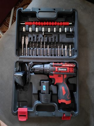 Vendo taladro atornillador BAMSE, prácticamente nuevo. Incluye cargador y una batería. - Taladro atornillador inalámbrico. - Incluye juego de brocas y puntas. - Maletín de transporte incluido. - Color rojo y negro. Usado para montar dos armarios y ya. Se entrega en mano en Mataró (zona juzgados)