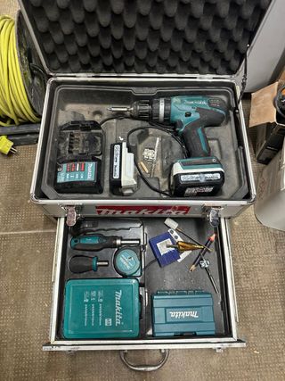 Vendo taladro Makita inalámbrico en buen estado. Incluye dos baterías y varios accesorios. - Taladro atornillador Makita. - Dos baterías. - Cargador de baterías. - Maletín de transporte.