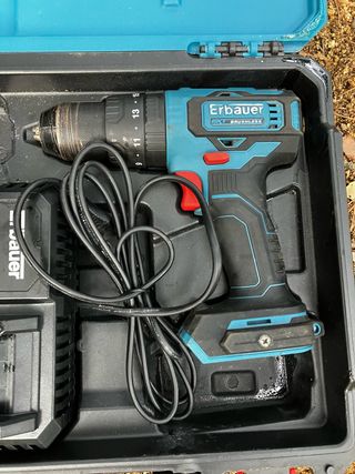 Taladro percutor Erbauer de 18V, ideal para trabajos de bricolaje y construcción. Se vende sin batería. - Diseño ergonómico para un agarre cómodo. - Mandril de sujeción rápida. - Incluye maletín para transporte y almacenamiento.