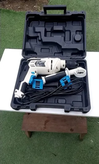 Taladro percutor de la marca RHINO, ideal para trabajos de bricolaje y construcción. - Incluye maletín rojo para transporte y almacenamiento. - Mango auxiliar para mayor control. - Cable de alimentación.