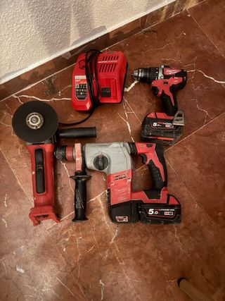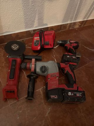 Se vende taladro percutor Milwaukee M18 + radial + atornillador con 2 batería 5AH y cargador rapido. - Taladro percutor inalámbrico. - 2 Batería M18 REDLITHIUM-ION de 5.0 Ah. - Cargador rápido M12-18FC.