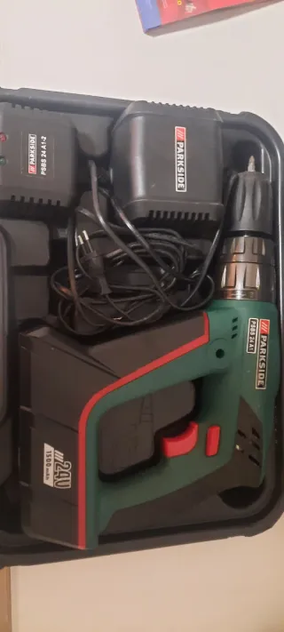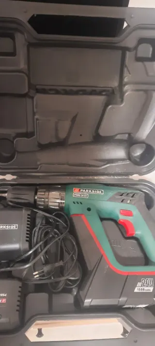Taladro Parkside a batería, en perfecto estado y listo para usar. - Modelo: PSBS 24 A1 - Voltaje: 24V - Capacidad de batería: 1500 mAh - Incluye cargador y maletín.