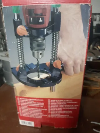 Soporte de columna móvil para taladro de la marca KWB. - Base azul. - Columnas metálicas con resortes. - Piezas naranjas de sujeción.