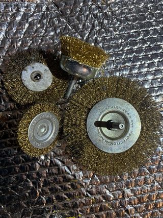 Set de cepillos de alambre para usar con taladro. Incluye diferentes tamaños y formas para diversas tareas. Escuadras Llaves etc - Cepillo tipo copa - Cepillo circular - Cepillo de copa pequeño - Material: latón