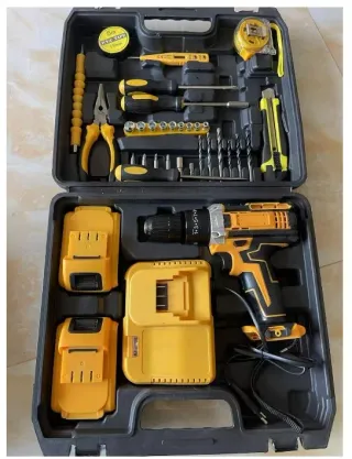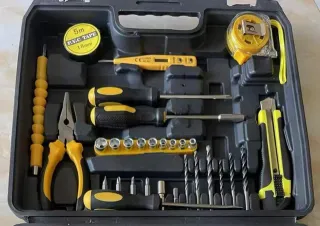 Maletín completo de taladro/atornillador/percutor inalámbrico ideal para bricolaje en casa o taller. Incluye taladro 21V, 2 baterías recargables de alta capacidad y cargador rápido. Múltiples accesorios: 3 brocas para piedra, 3 brocas para madera, puntas de atornillar, vaso de llaves de tubo, alicates, destornilladores, cúter, cinta métrica, cinta aislante y eje flexible extensible para zonas de difícil acceso. Velocidad regulable y función percutor para paredes. Todo organizado en resistente maletín de transporte. Nuevo sin usar