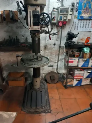 SE VENDE MAQUINARIA DE TALLER COMPLETO POR JUBILACIÓN, PRECIOS A NEGOCIAR, PARA MAS INFO 695420966. Taladro de columna Sansón-25. Altura 180cm, columna 140mm diámetro, 6 velocidades 65-120-215-350-660-1190rpm., mesa inclinarse 90grados, giro mesa sobre columna 360grados, Mesa 450mm con mordaza y brocas - Modelo robusto y fiable. - Ideal para trabajos de precisión. - Construcción duradera.