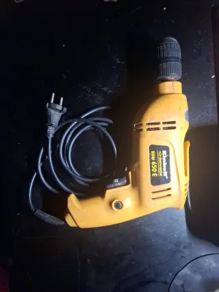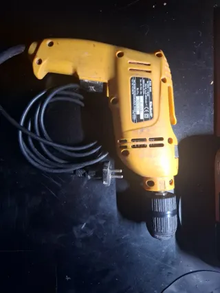 Taladro eléctrico de la marca DeWalt con cable de alimentación. - Mango auxiliar para mayor control. - Portabrocas. - Incluye maletín de transporte.