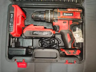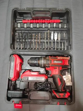 Taladro atornillador Bamse con baterías y accesorios. - Incluye taladro atornillador Bamse. - Dos baterías de 21V. - Cargador. - Juego de brocas y puntas. - Extensión flexible.