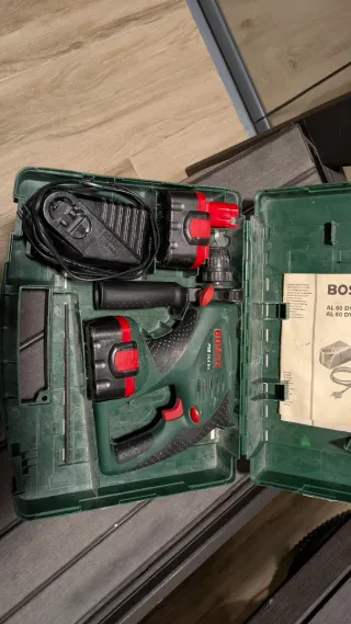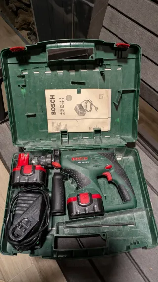 Taladro percutor a batería Bosch en su maletín. - Incluye taladro, cargador, 2 Baterías y el manual. Funciona perfectamente, se vende por cambio a uno más moderno por regalo.