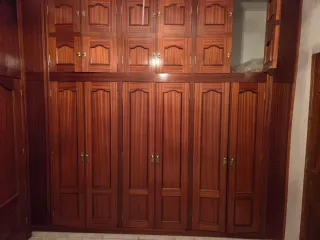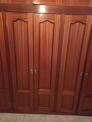 Conjunto de puertas de armario de madera con un diseño clásico y elegante. Precio a convenir. - Fabricadas en madera de alta calidad. - Acabado en tono caoba. - Diseño con paneles y molduras. - Tiradores dorados.