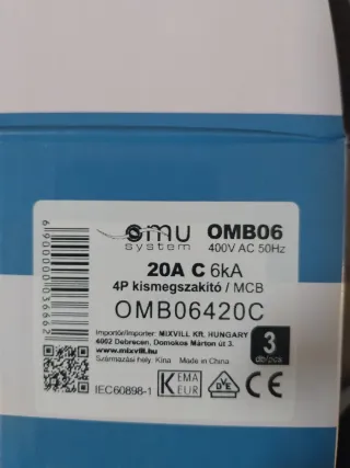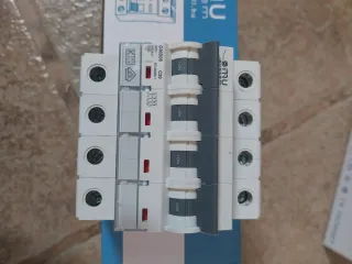 Magnetotermico de 4 polos con una intensidad de 20A. - Modelo: OMB06 C20. - Tensión nominal: 400V. - Frecuencia: 50/60Hz. - Cumple normativa IEC60898-1.