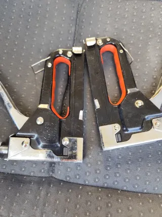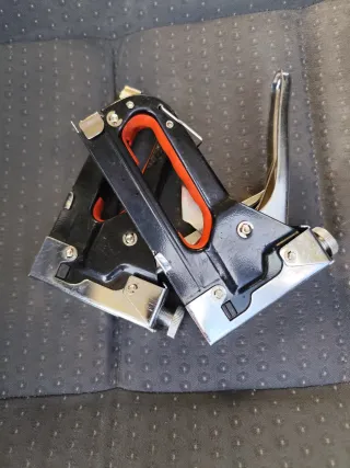 Herramienta manual para grapar. - Mango con detalles en color naranja. - Cuerpo principal en color negro. - Partes metálicas plateadas.