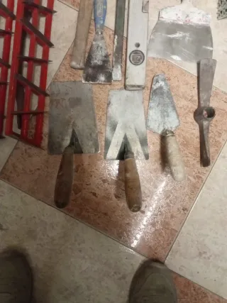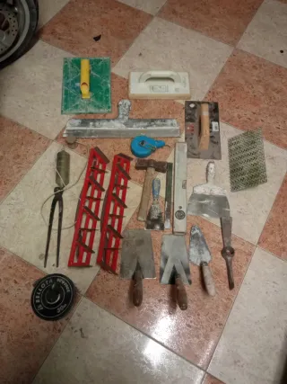 Conjunto de herramientas para albañilería, ideal para trabajos de construcción y reformas. - Paletas de diferentes tamaños. - Llana. - Martillo. - Nivel. - Cortador de alambre. - Regla de albañil. - Esponja de fratasar. - Cinta métrica. - Otros accesorios.