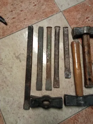 Lote de herramientas manuales para trabajos diversos. - Incluye varias macetas de diferentes tamaños. - Se incluyen cortafríos de metal.