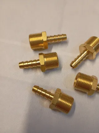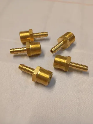 Lote de conectores de latón para manguera. - Fabricados en latón. - Diseño de espiga para conexión segura. - Rosca macho para acople. - Set de 5 unidades.