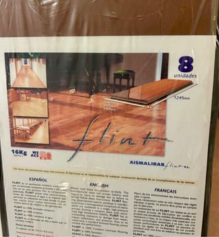 Dos paquetes de tarima sintética marca FLINT en color Haya. Cada paquete contiene 8 unidades. - Medidas de cada lama: 1245mm x 197mm. - Grosor: 5.4mm. - Resistente al agua y al impacto. - Fabricación 100% sintética.