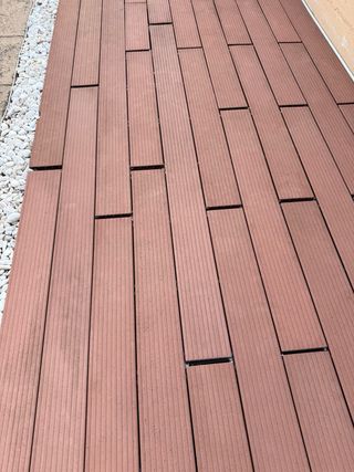 Suelo de tarima para jardín, en buen estado. Es de composite, ideal para exterior. - Material composite de alta calidad. - Resistente a la intemperie. - Fácil de limpiar y mantener. - Color marrón oscuro. La persona que lo quiera lo tiene que venir a recoger.