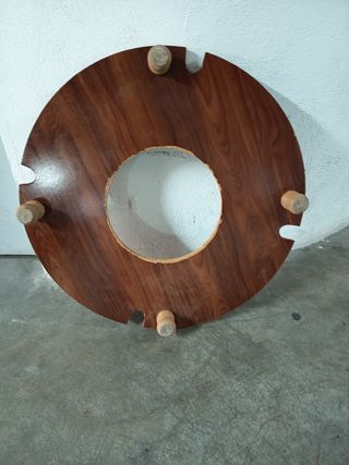 Tarima redonda de madera con acabado imitación roble, diseñada para braseros de mesa. - Diámetro exterior de 90 cm. - Hueco central. - Diseño con muescas en el borde.