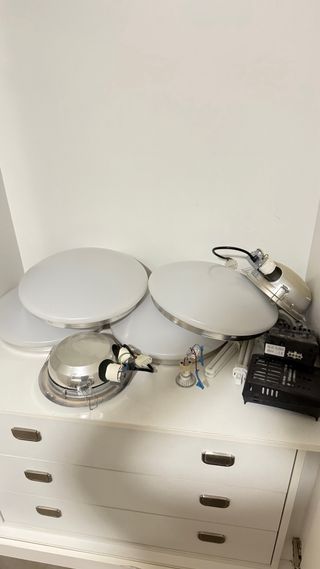 Lote de focos y accesorios de iluminación. - Focos redondos de luz. - Focos empotrables. - Tubos fluorescentes. - Balastros para iluminación. Los 6 por el precio marcado Individuales por 10€