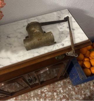 Pieza antigua para cerrar puertas, con un diseño robusto y un acabado que denota su edad. - Mecanismo de engranaje visible. - Materiales de metal y piedra.