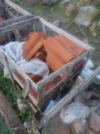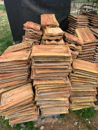 Conjunto de tejas antiguas de barro, ideales para proyectos de restauración o decoración rústica. - Material: Barro cocido. - Color: Tonalidades rojizas y anaranjadas. 9 pales de tejas 200€ todo kitadas de una casona de potes