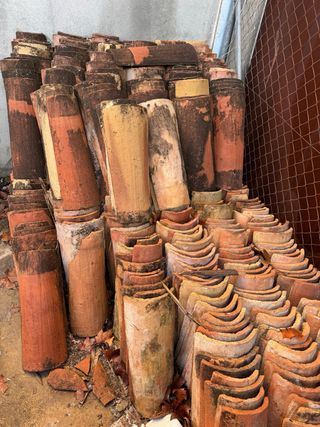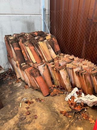 Lote de tejas árabes antiguas, perfectas para proyectos de restauración o construcción con un toque rústico. - Material: Cerámica. - Color: Tonos terracota y ocres. - Aspecto: Desgastado por el tiempo, con pátina natural.