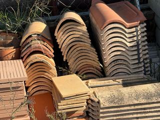 Lote de tejas de diferentes tipos y materiales, ideales para reparaciones o proyectos. - Tejas curvas de barro tradicionales. - Tejas planas de cerámica. - Variedad de tamaños y acabados.